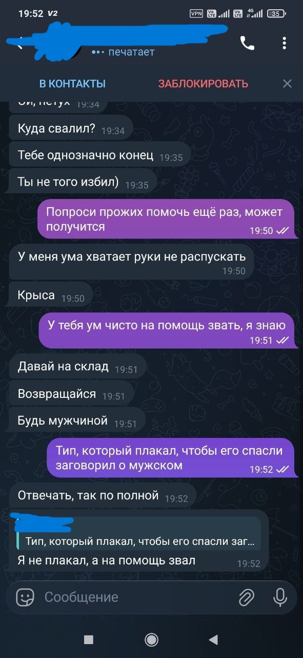 После смены я подошел к нему и спросил за "дебила", на что после недолгого разговора услышал ответ "хуесос, иди нахуй". Я ударил его в челюсть. После этого повалил на пол и начал гасить ногами, время от времени прописывая в голову кулаками. Он начал плакать и просить прохожих людей ему помочь. Кричал "ПАМАГИТИ!!! МЕНЯ БЬЮТ!!! ПОЖАЛУЙСТА ПАМАГИТИ!!!". На его крики о помощи прибежал какой-то мимокрок с просьбой не бить его по голове, т.к я мог бы что-то ему сломать. Я ответил "хорошо" и ударил в последний раз его в челюсть кулаком. После этого попинал ногами и пошел обратно в центр.