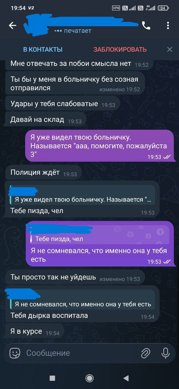 Он побежал за мной и на лестничной площадке в курьерском центре устроил какую-то хуйню. Начал махать кулаками куда-то в воздух, надеясь в меня попасть. Потом забежал в центр и попросил персонал вызвать полицию, т.к его избили. Я просто взял сумку и пошел домой играть в кс.