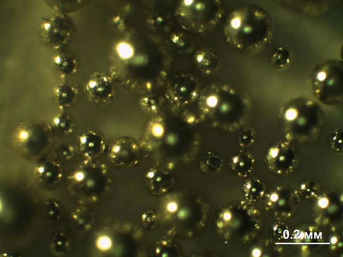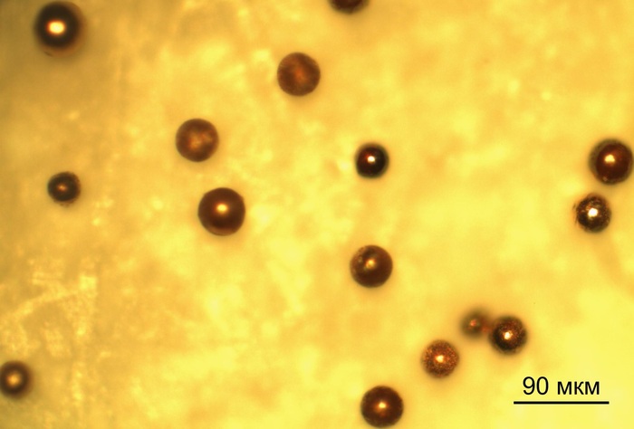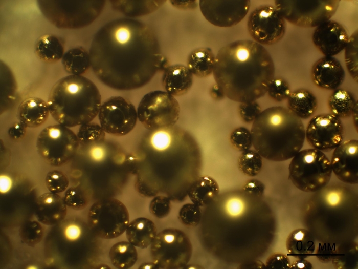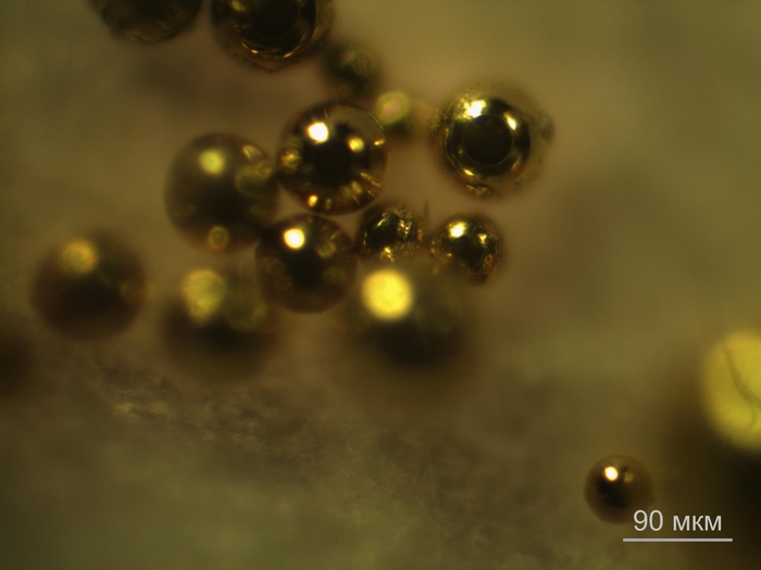 Сферические частицы полученные при распылении проволочки диаметром 0.2 мм из золота 999 пробы на жидком аноде.