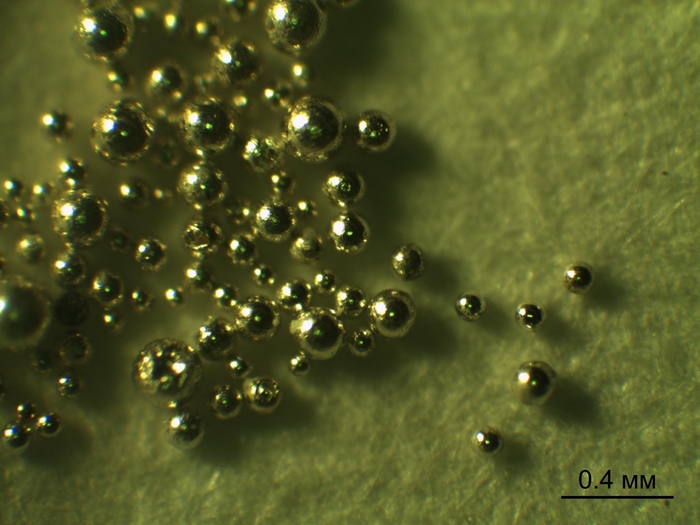 Сферические частицы полученные при распылении проволочки диаметром 0.3 мм из серебра 999 пробы на жидком аноде.