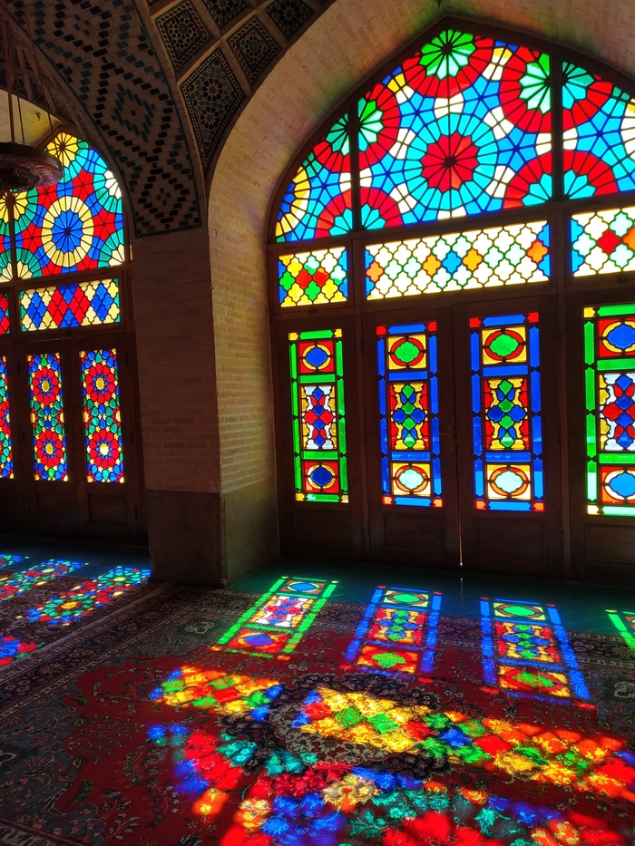 Радужная мечеть Насир оль-Мольк — уникальная в своём роде. Радужной её называют, потому что когда солнце попадает в цветные витражи на окнах — зал внутри преображается и искрится разноцветными красками. А Розовой — не только из-за цвета наружных стен, а потому что в отделке использовано много роз.