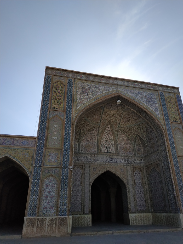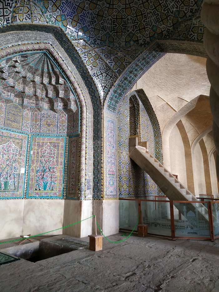7. Во внутреннем убранстве мечети используется чёрная, белая, синяя, голубая, красная, терракотовая и жёлтая плитка. Эти же цвета используют и в других зданиях Шираза.