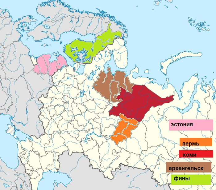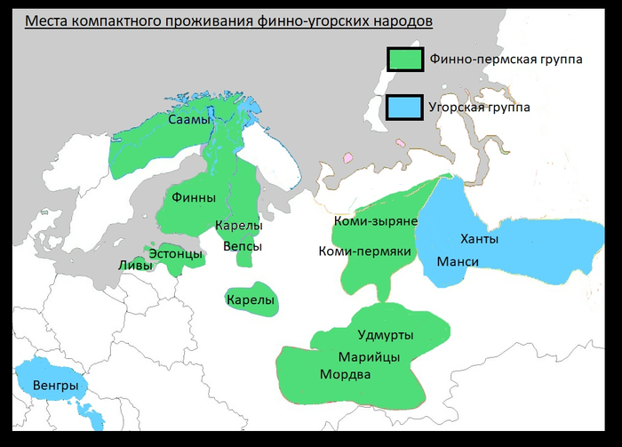 Так или иначе, распространение финно-угорского языка четко прослеживается (Карелия здесь не отмечена, т-к я не был уверен - входит ли она в эту языковую группу).