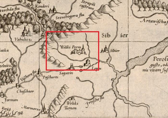 "Великая и обширная область Пермия» и «в ней есть город того же имени" - написал он в своей заметке, когда (очевидно) посещал эти места. К слову, Герберштейн жил с 1486 до 1566, и если он действительно говорит про Пермь, то с картой Меркатора все сходится.