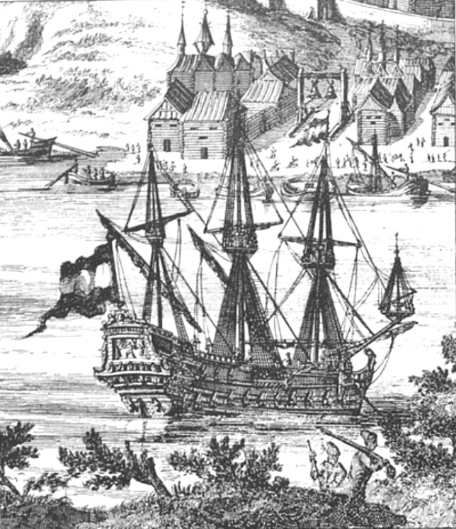 Однако на других гравюрах встречаются и иные варианты. Например, книга бывшего парусного мастера «Орла» Яна Стрёйса о его путешествии в Россию проиллюстрирована рисунком, на котором отчётливо видны три разные полосы, причём белая расположена посередине, как на голландском флаге.