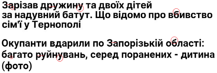 Согласно вирусному скриншоту, новость об убийстве в Тернополе появилась 7 декабря в 10:14 на сайте «Телевизионной службы новостей» под заголовком (переведено с украинского языка) «Зарезал жену и двоих детей за надувной батут. Что известно об убийстве семьи в Тернополе». При этом в оригинале использовано слово «двоїх», хотя, согласно правилам украинского языка, должно быть написано «двох». Кроме того, в лиде не обособлен деепричастный оборот «повернувшись додому», а в конце предложения не стоит точка. Можно предположить, что это опечатки, но кажется маловероятным, что такое количество ошибок могло появиться в двух предложениях и со временем их никто не исправил (на момент создания скриншота было почти 8000 просмотров).