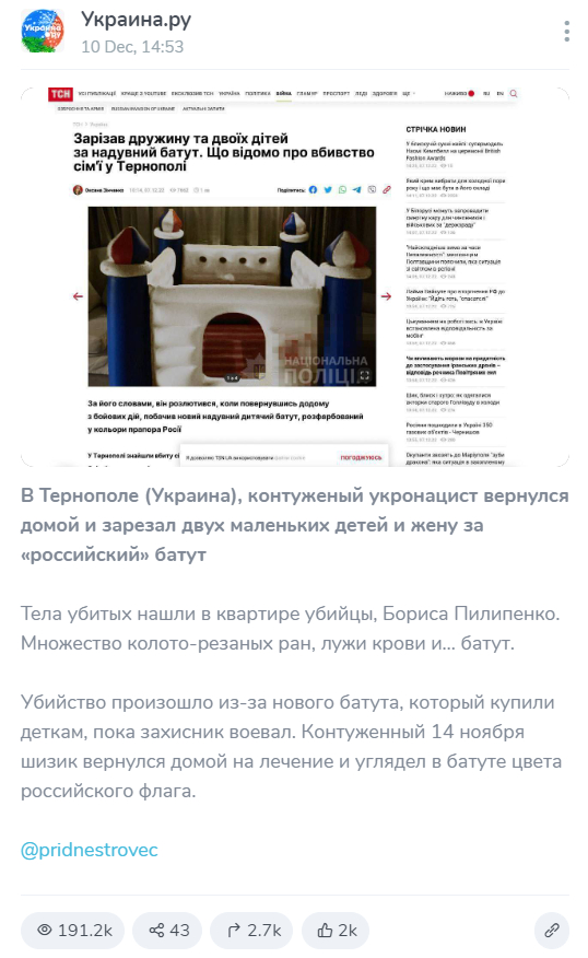 Новость об этом тройном убийстве начала распространяться по Сети 10 декабря 2022 года. Согласно интернет-публикациям, солдат Вооружённых сил Украины по имени Борис Пилипенко (иногда Пилепенко) 14 ноября во время боевых действий получил контузию головного мозга и после реабилитации вернулся в родной город Тернополь, где ножом зарезал жену и двоих детей. Поводом якобы послужил детский надувной батут в цветах российского триколора — боец подумал, что дома произошла измена родине, и впал в бешенство от вида вражеского флага. Также сообщается, что семья украинца получила этот батут в качестве гуманитарной помощи для детей из Франции и что полиция Тернополя завела уголовное дело по статье убийство. Такие публикации встречаются на сайтах «Общественной службы новостей», телеканала «Рен-ТВ», «Федерального агентства новостей», «Правда.ру», «Русская семёрка» и других новостныхресурсах.