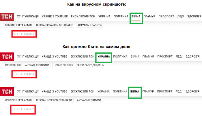 Однако, если внимательно сравнивать вирусный скриншот и наш, можно заметить, что на вирусном выше заголовка указана совсем другая рубрика — «Украина», хотя там тоже должна быть указана рубрика «Война».