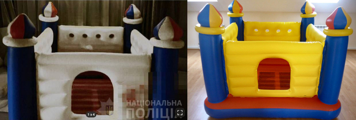 Судя по всему, на фото из поддельного скриншота запечатлён надувной манеж-батут от фирмы Intex. Однако в Сети нам не удалось найти батут в бело-сине-красной расцветке, поскольку на оригинальном продукте вместо белого цвета жёлтый. Также существует мини-версия этого батута, но цвета на нём отличаются ещё больше.