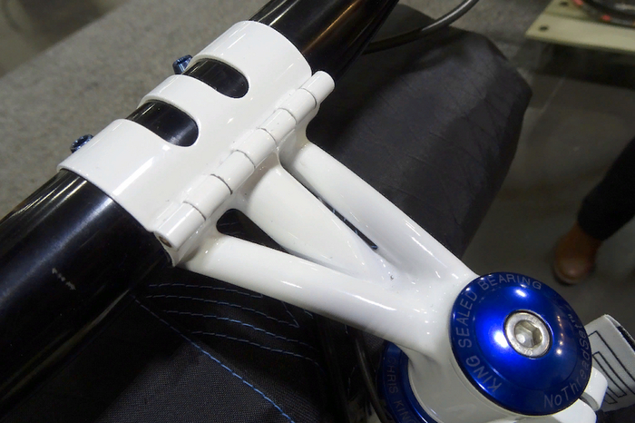 Вынос и багажник являются единым целым вилки, поэтому имеются шарниры и зажимные болты рулевого штока, он полностью съёмный.