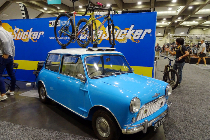 Майк Леви проводил обзор велосипедной группы Sea Sucker на своем праворульном светло-синем Mini Cooper. Sea Sucker был на выставке в виде двух байков близнецов.