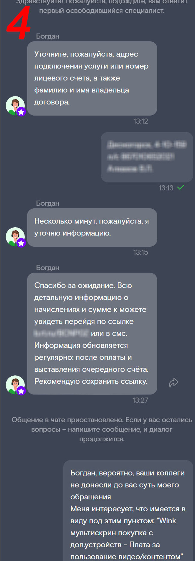 Отдельно, несколько слов о самом общении) По любому вопросу вам надо пробиться сквозь бота - а его задача, в свою очередь, не дать вам этого сделать) Это - первая супень решения проблем. Особо нетерпеливые закрывают чат и идут оплачивать, гори оно огнём... У меня получилось быстро, природное обаяние не скрыть, да) А вот дальше начинается карусель. Оператор Маша вас выслушает, но переключит на оператора Сашу, Саше надо всё это ещё раз рассказать, и он переключит вас на оператора Дашу. Которая, как ни странно, тоже захочет вас выслушать) И уж выслушав...(угадайте?)) да, переключит вас ещё на кого-то... вероятно, в этом заложен алгоритм отсеивания чуть более настойчивых... но я и его прошел! Последний, Самый Специальный Специалист подошел к делу профессионально. И даже попросил меня предоставить мои учетные данные. (странно, а зачем же я каждый раз авторизируюсь, чтобы войти вот в этот чат?!)) После чего, с чувством хорошо выполненной работы, дал мне ссылку ... да, на мой же личный счет, с которого всё начиналось, с тем же самым долгом в те же самые 284 рубля. Историю которого я так пытался выяснить.