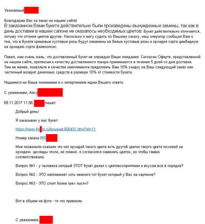 Это первый ответ от них. Там было еще писем 8. В одном из них она прислала фото, которое сделал курьер до доставки букета.