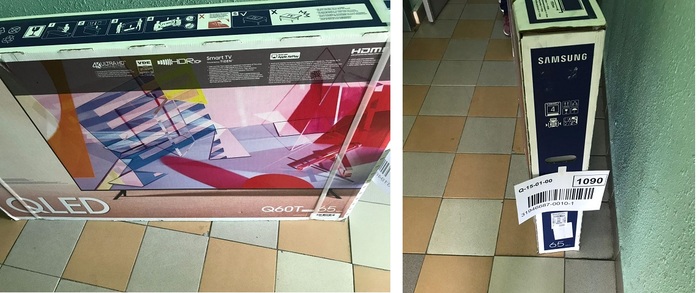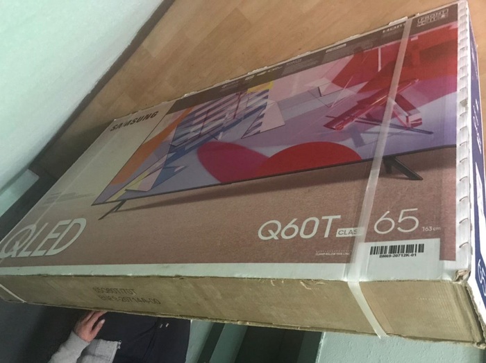 И вот, день доставки, приезжает курьер, просит меня спуститься помочь - одному такую громадину поднимать неудобно. Без вопросов подрываюсь, лечу вниз в одном носке. Выгрузили, значится, мы эту громадину из машины, занесли в подъезд, стоим, ждем лифт. Я смотрю на коробку источника моих будущих удовольствий и в нижнем углу замечаю маленькую надпись - Q60T (модель младше и дешевле соответственно).