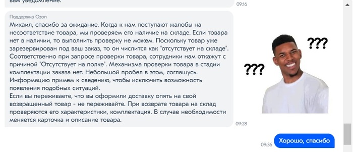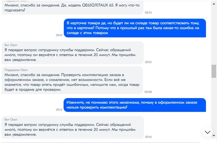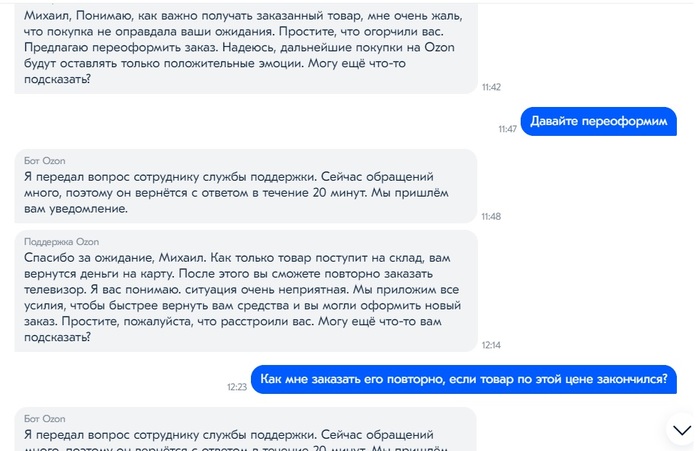 Пишу в чатик моему дорогому Озону: - Родные мои, милые, вы мне не то привезли, - а в ответ: Ожидайте 20 минут (чаты крупных компаний с их ИИ это вообще отдельный разговор).