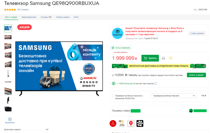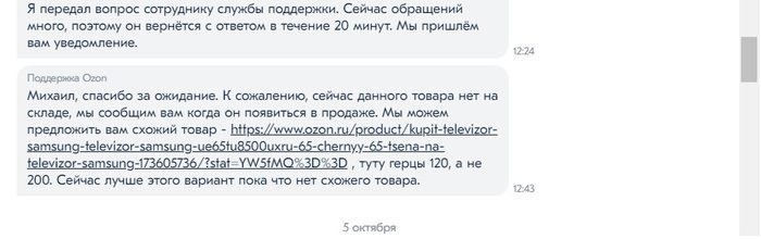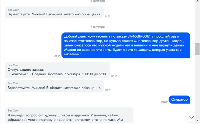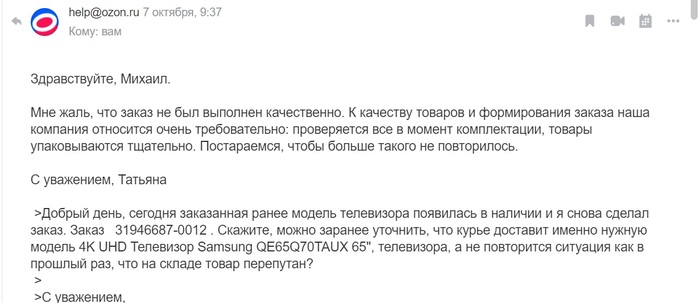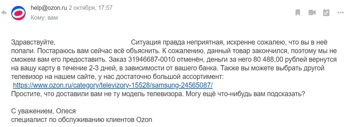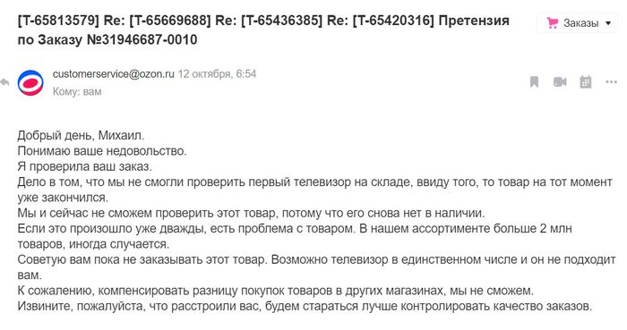 Пишу этот псто не ради разрешения этой ситуации, потому что для меня история закончилась хорошо - этот телевизер я таки купил в другом крупном магазине по акции - белый, новый, не витринный, и вышло не особо дороже, чем на Озоне (ищущий да обрящет, как говорится).