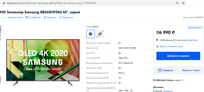 Так я опустился до того, что перестал посещать сайты соц. сетей, вместо них моими ежедневными таймкиллерами стали интернет площадки. Теперь, просыпаясь, я первым делом заходил в приложение Вайлдберис, в обеденный перерыв я проверял Озон, Мвидео, Эльдараду, а засыпая обновлял неповоротливый мобильный сайт ДНС. И вот, спустя примерно неделю - чудо! Древние легенды о счастливчиках покупающих ящики с 30-40% скидкой оказались реальностью - в очередной раз проверяя Озон вижу один из искомых мной вариантов - GNUSMAS QE65Q70T по цене 79 990 деревянных. Со скоростью летучей мыши, я помчался за кошельком с картой, чтобы быстро заказать и оплатить (у Озона сейчас только предоплата) это корейское чудо техники российской сборки, по такой адекватной цене, пока всё не раскупили (почувствовал себя участником видосов про черную пятницу в этих америках). Минут через 30 посмотрел - телики разобрали, ходовой товар видать, кризис же на дворе. Но я таки успел урвать свой экземпляр.