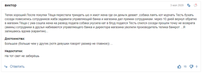 Ну, думаю, неплохо - пацаны отвечают за базар. Вот что значит покупать в крупной компании. Ага, хер там плавал. Через 20 минут отвечают в чате: - Извините-отсосите, сейчас такого же товара нет в наличии, можете заказать аналогичный телевизор, который в 20 раз хуже, но вам непохуй ли не все ли равно? Деньги вернутся через 2-3 дня. Чао.