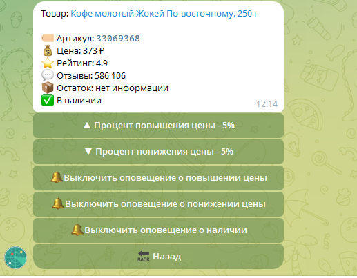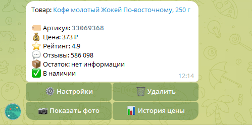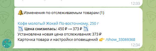 Пример: товар «Аккумуляторный фонарь» был в наличии всего 3 часа по цене 745 ₽ вместо 8 000 ₽. Кто не успел — тот проиграл.Обычный пользователь не узнает об этом. А вот бот — да. Он присылает уведомление в течение 15 минут после изменения.Главное — не верить первому снижению. Иногда это маркетинговая игра. Поэтому бот сохраняет историю цен и показывает график. Если цена резко упала с 8 000 до 700 — это либо ошибка, либо распродажа. График всё покажет.