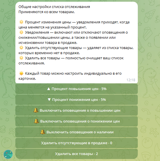 Общие настройки для всех товаров - то же что и настройки товара, но применяется для всех товаров в списке отслеживания.