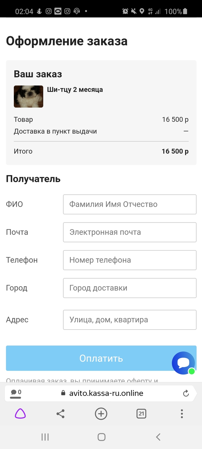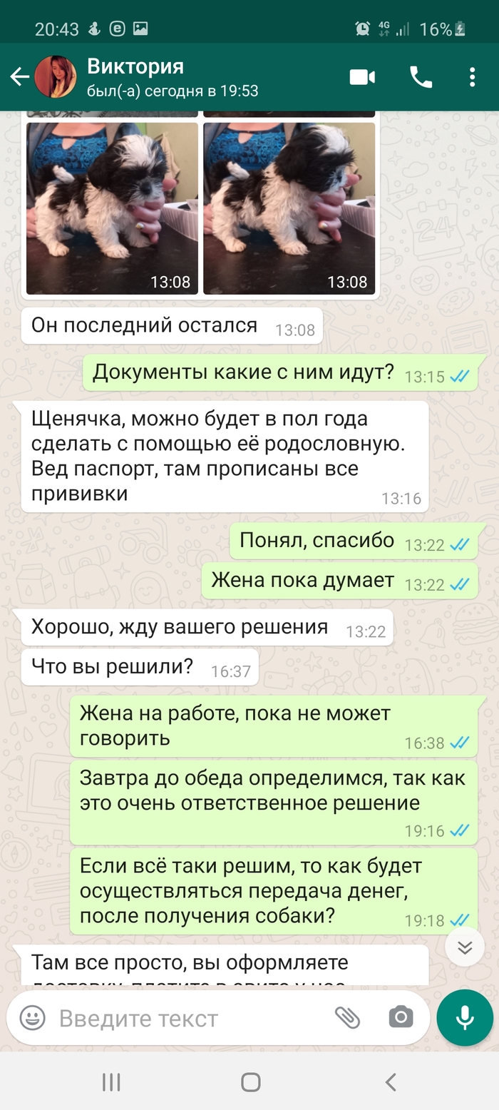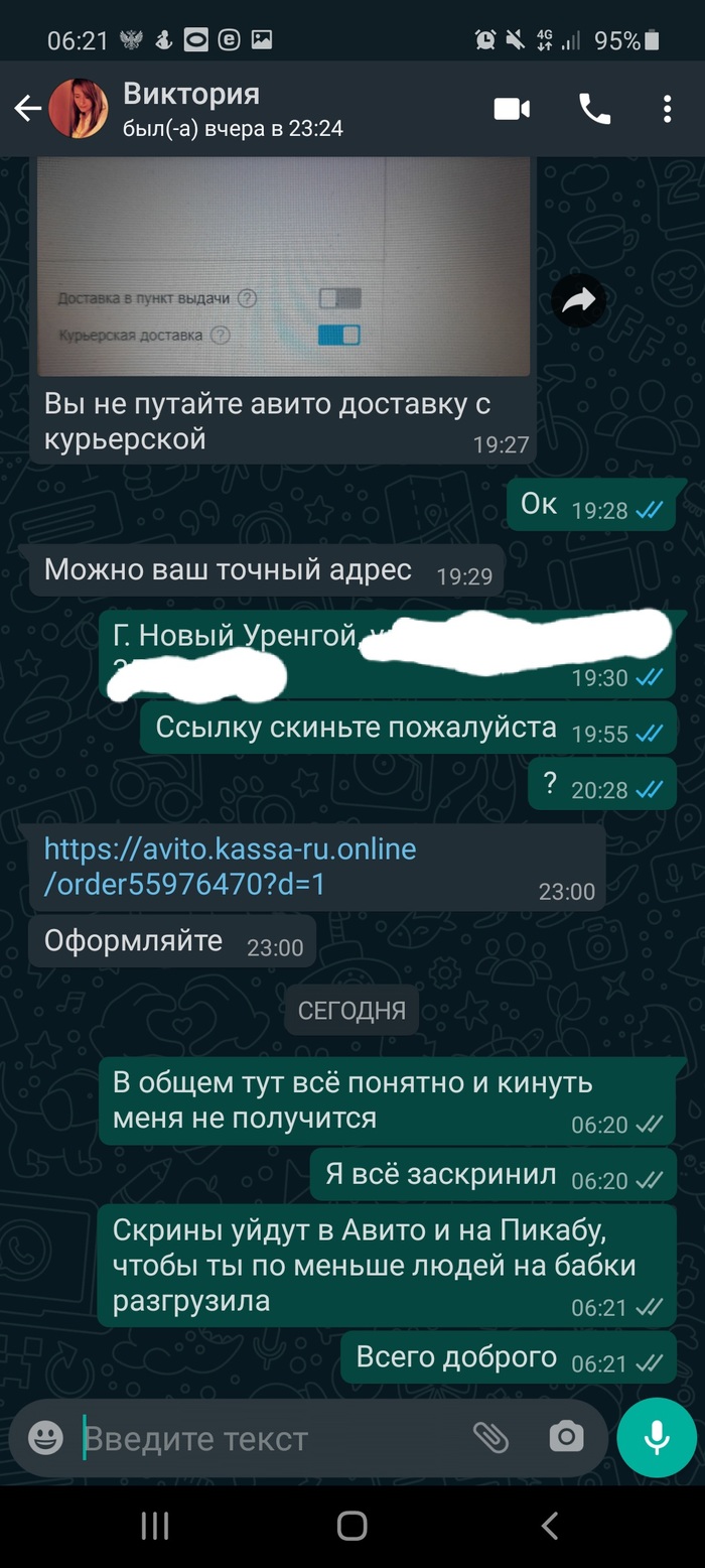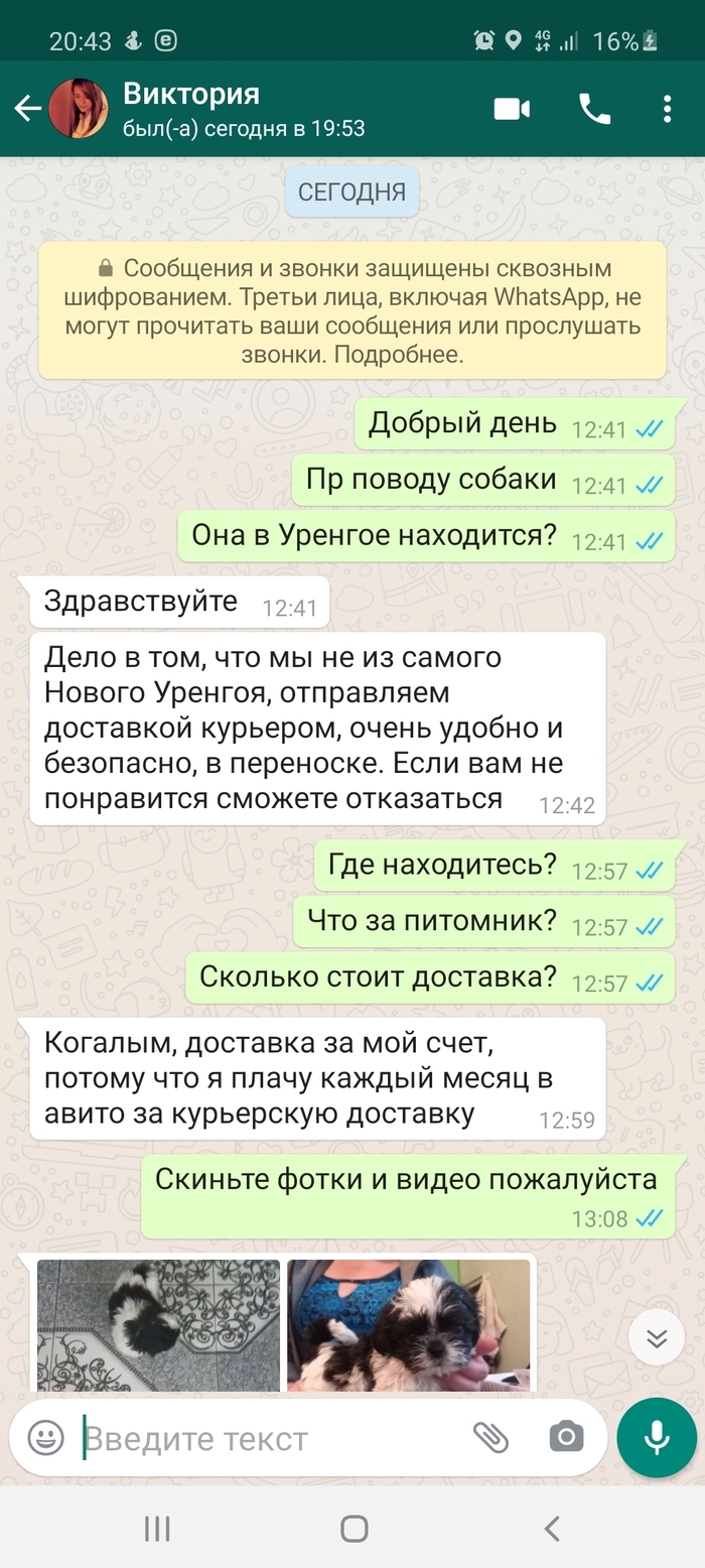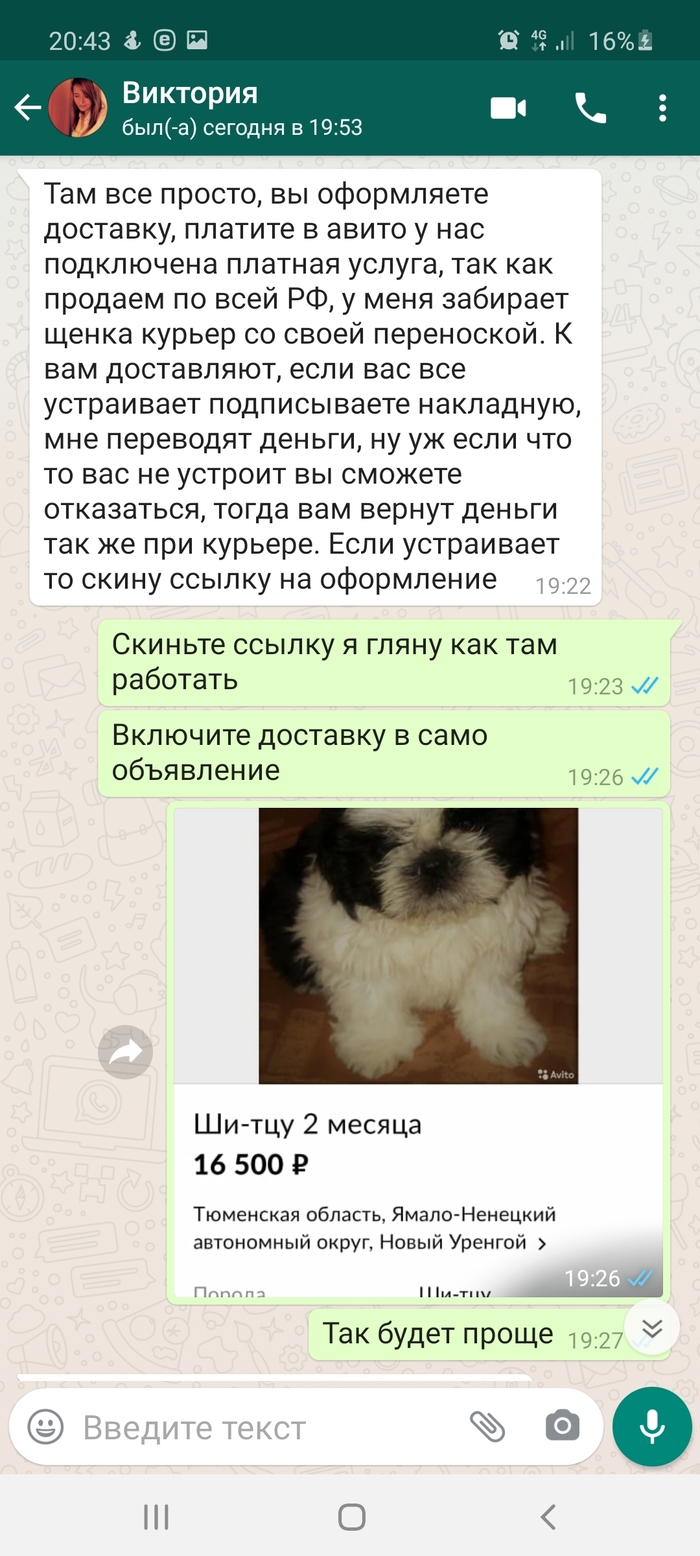 Здравствуйте! Дети просят собаку и я начал штудировать Авито. Так как у нас в Новом Уренгое собаки стоят дорого, а Ши-Тцу вообще не разводят пошёл курить Авито. Нашёл объявление Виктории из Когалыма. Она продавала собаку по прекрасной цене, но в написании названия породы ею была допущена ошибка, я это сомнение отмёл, ссылаясь на то, что сам после ночной смены туплю будь здоров. Написал Вике, она предложила уйти в Вотсап и там перетереть. Это был 1 звоночек. Ну думаю ладно, посмотрим куда кривая выведет. По запросу скинула и фотки и видос где резвится пёсель. Да и доставка бесплатная. Сказка, а не продавец. Я попытался было попросить, чтобы она доставку в само объявление включила, но она мне на это парировала, что доставка курьерская (Новый Уренгой - Когалым, расстояние 619 км) и вообще она за курьера Авито платит каждый месяц и ей норм. 2 звоночек прозвенел и я понял, что собаки пока у нас не будет. Можно было на этом закончить беседу, но я решил дойти до финала и попытаться выяснить метод отъёма денег Викторией у населения. Попросил ссылку, она попросила точный адрес. Ссылку и 3 звоночек получил. В общем скрины переписки, объявлений и странички ЛжеАвито прикрепил. Просьба поднять в топ, ибо не все в нашей стране знают об этом разводе если такие ребята ещё мутят фэйковые объявления. Всем добра! Не отправляйте бабосы мошенникам Вам есть куда их потратить.