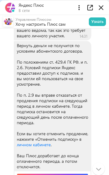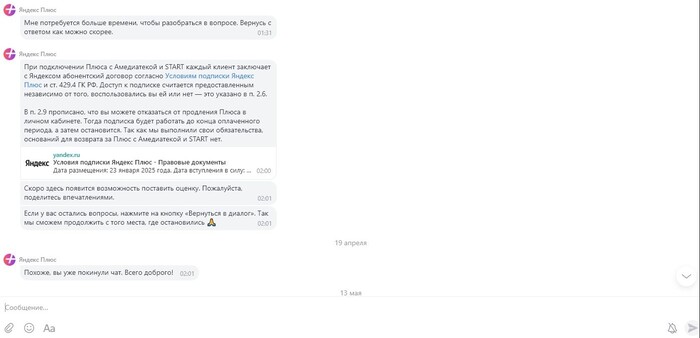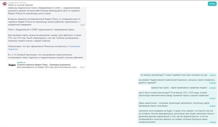 После напоминаний о том, что я все еще требую разобраться в вопросе, сотрудник поддержки вернулся и продублировал ответ, ранее предоставленный мне. Контекст все тот же - подписка подключена 10 марта, данными карты они не владеют и списать не могли. К ответу прикрепили пункты соглашения. Никакие мои уверения о том, что я эту подписку не подключал, не сработали и это на фоне того, что Кинопоиском я не пользуюсь от слова совсем.