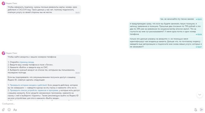 Но далее начался игнор. Мне все таки удалось "выдавить" еще одно сообщение от поддержки, но оно ничем не отличалось от предыдущих. Мне в очередной раз поведали, что у меня один аккаунт на почте, а другой на номере телефона и что и там и там активны подписки. Никакие призывы к скринам, предоставленным ранее, доказывающим, что их слова чистое вранье, не возымели эффекта. Хотя это наверное я ожидал неоправданного эффекта, ведь воры и так знают, что они воры. В итоге "чатовые войны" закончились очередной отмашкой от клиента