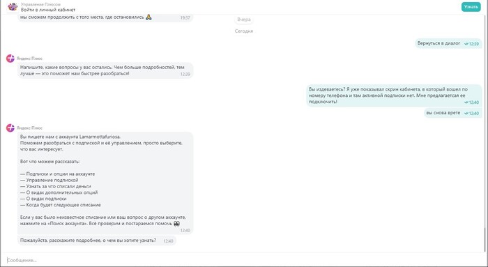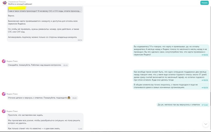 Также, имею субъективное мнение о том, что это уже "специалисты" Яндекс разделяют данные пользователя и присваивают им отдельные учетные записи, чтобы проворачивать подобные схемы воровства. Но вернемся к общению с поддержкой.