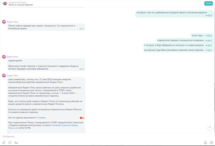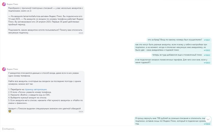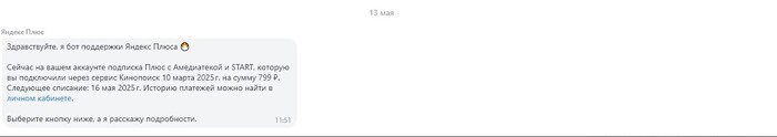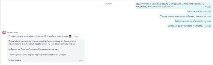 Итак, как многие наверное уже догадались, главным "героем" событий является продукт одноименной компании Яндекс +. В апреле 2024 года я приобрел колонку "Алиса" и купил подписку Яндекс - плюс сразу на год. Все работало прекрасно, никаких сбоев подписка не давала до марта месяца нынешнего года. Я даже не заметил сразу, что у меня произошло два списания по 799 рублей, в марте и апреле. Я обращаюсь в банк, сообщаю, что я этих выплат не производил и никаких услуг по таким тарифам не подключал. Но сотрудник банка (Альфа - Банк, вам пламенный привет) сообщает, что ничем помочь не может, советует обратиться в поддержку Яндекс и это при том, что апрельский платеж еще находился в процессе обработки на момент моего обращения в банк. Ну если у нас Альфа - Банк совершенно бесполезен в плане совершения платежей и возвратов за ложные списания, придется обращаться в поддержку Яндекс. Соответственно описываю проблему сотрудникам поддержки, где у меня были затребованы данные карты и скрины платежей. Всё предоставляю и жду ответа.
