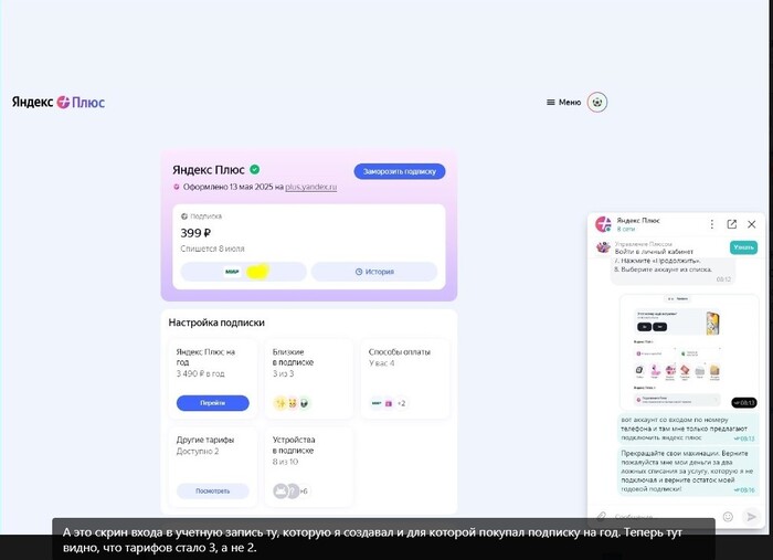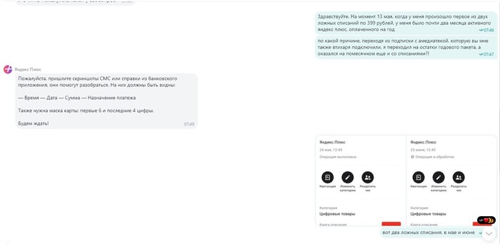 Но к чему это я? А к тому, что вчера я заметил очередные списания с карточки))) И снова назначение цифровые товары Яндекс плюс. Снова два списания, но уже по 399 рублей, первое 24 мая, второе 23 июня. Но ты ведь наверняка не успел забыть, мой дорогой друг, что у меня активна годовая подписка Яндекс-плюс сроком еще почти на два месяца. Отсюда возникает вопрос - для чего мне, имея подписку яндекс плюс, оформлять еще одну с такими же функциями, но уже более дорогую? В чем логика? Ну, думаю, тут точно добьюсь справедливости, ведь нестыковка очевидна и снова отправляемся в чат.