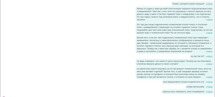 Старший специалист, Семен, отвечает мне, что с 13 мая у меня работает помесячный плюс, поскольку у меня закончились все подписки (Амедиатека, и годовой плюс - они его называют подпиской по промокоду, поскольку я покупал его в М Видео, а цифровые товары продаются в виде промика).