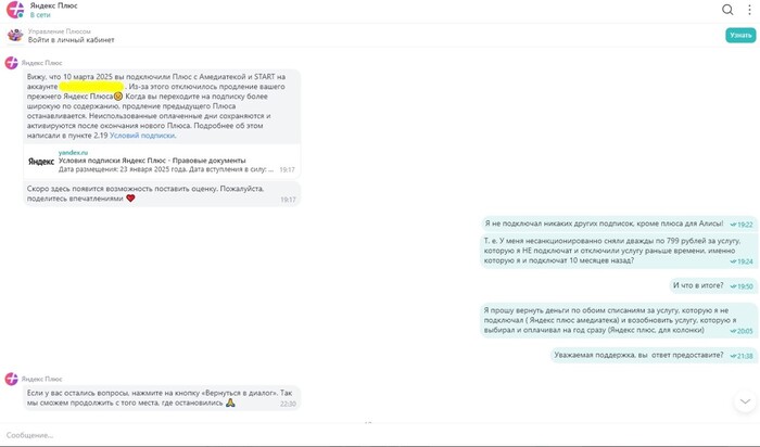 Особое внимание прошу обратить на скрин выше, на первое сообщение оператора, где он сообщает мне о двух подписках, датированных 2025 годом.
