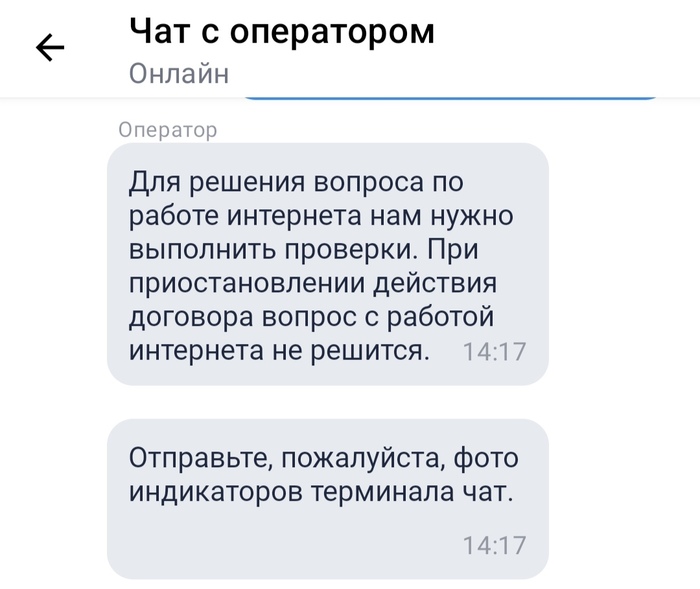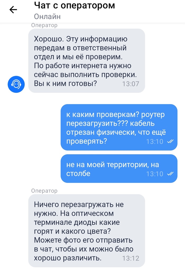Обнаружил утром что обрезаны провода интернета, от столба до дома. Пишу в техподдержку оператора, всё это описываю и скидываю фото. И знаете что они у меня спрашивают? "Какие лампочки горят на терминале")))) что это, тупой скрипт от которого нельзя отходить или тупость оператора? Или я тупой и при физическом обрыве кабеля важны лампочки на абонентском оптическом терминале?