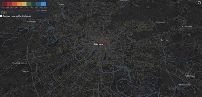 В 50-60 х годах Советский Союз строит 1 миллиард 205 миллионов (!) квадратных метров жилья. К концу 1960-го общий объем построенного — 2 миллиона 600 тысяч квартир. В том же году новые дома составляют уже 88% от всего жилья в стране. Оценить масштаб можно, посмотрев на эту карту с возрастом домов в Москве. Жёлтый цвет — время правления Хрущёва.