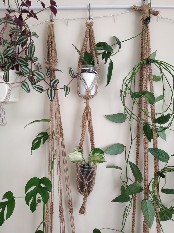 Горшки из ИКЕА по 5 шекелей, веревки из магазина хозтоваров не помню какого, заморыши-растюхи с темных углов и высоких полок, опора для цветка в одном из горшков с ебея, ручки из... ну и ладно, как получилось, так и висит. Зверушка сам пришёл. Зовут Тучка. Сфотано мобилой, горизонт завален