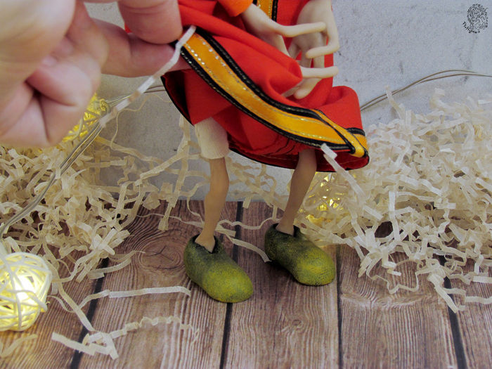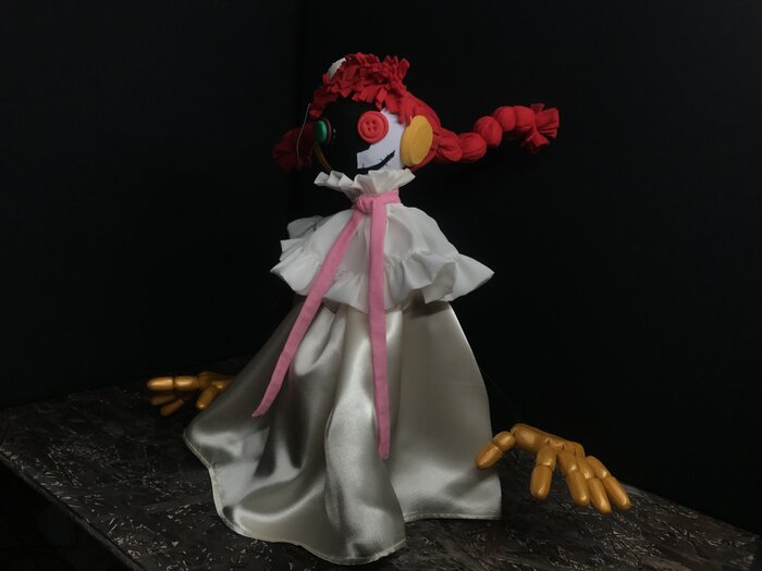 Для достижения большего сходства я сделала ей шарнирные ручки, за счет чего каждый пальчик двигается. А сами ручки потом крепились на черную проволоку, которая имитирует нити оригинала.