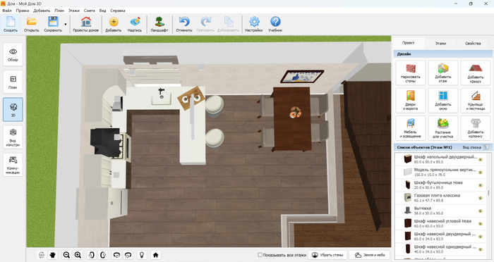 Выбор отделки, расстановка мебели и декора осуществляется сразу в 3D-режиме, можно менять материалы на разных деталях одного объекта (например, фасады и фурнитура).