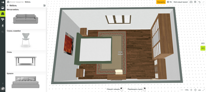 Удобный и функциональный онлайн-планировщик от отечественного разработчика. РумПлан – отличный инструмент, если вы хотите не просто «поставить шкаф», а детально проработать весь дизайн-проект прямо на чертеже, не заморачиваясь сложными программами.