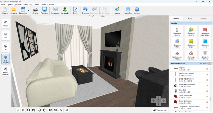 Мебель и отделка: в программе 340 моделей реальной и 950+ материалов для отделки. Вы буквально красите стены и кладете плитку, выбирая фактуру и цвет. В итоге вы получаете не фантазию робота, а реальный дизайн-проект.