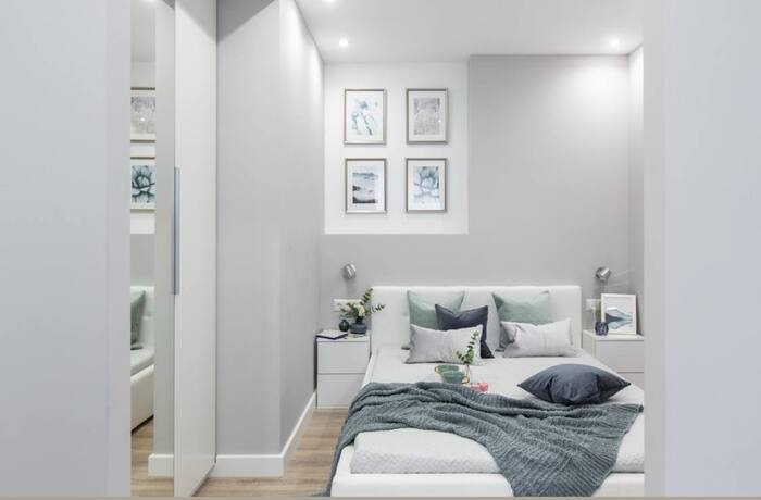 Спальня оформлена сдержанно, но выразительно: оливково-серое изголовье с фактурной отделкой, встроенные светильники, акцентная фреска.