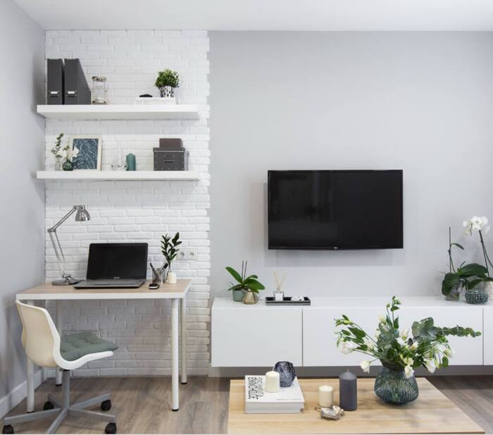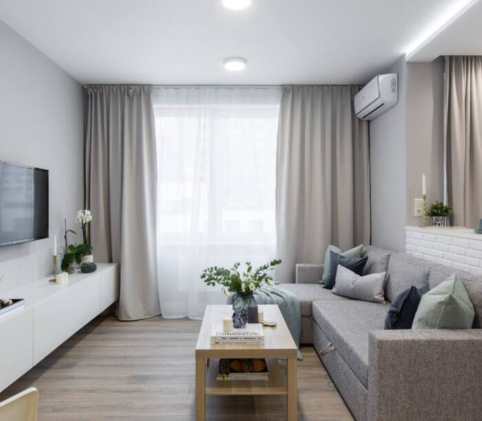 Вдоль противоположной стены разместили скрытую систему хранения с лаконичными фасадами и высоким комодом под ТВ. Обстановка минималистичная, но уютная — без визуального шума, с акцентом на комфорт и симметрию.