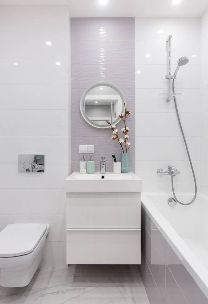 Ванная комната организована с размещением техники в шкафу-колонне и дополнительными местами хранения под раковиной. Ванна совмещена с душем, встроены ниши для хранения.