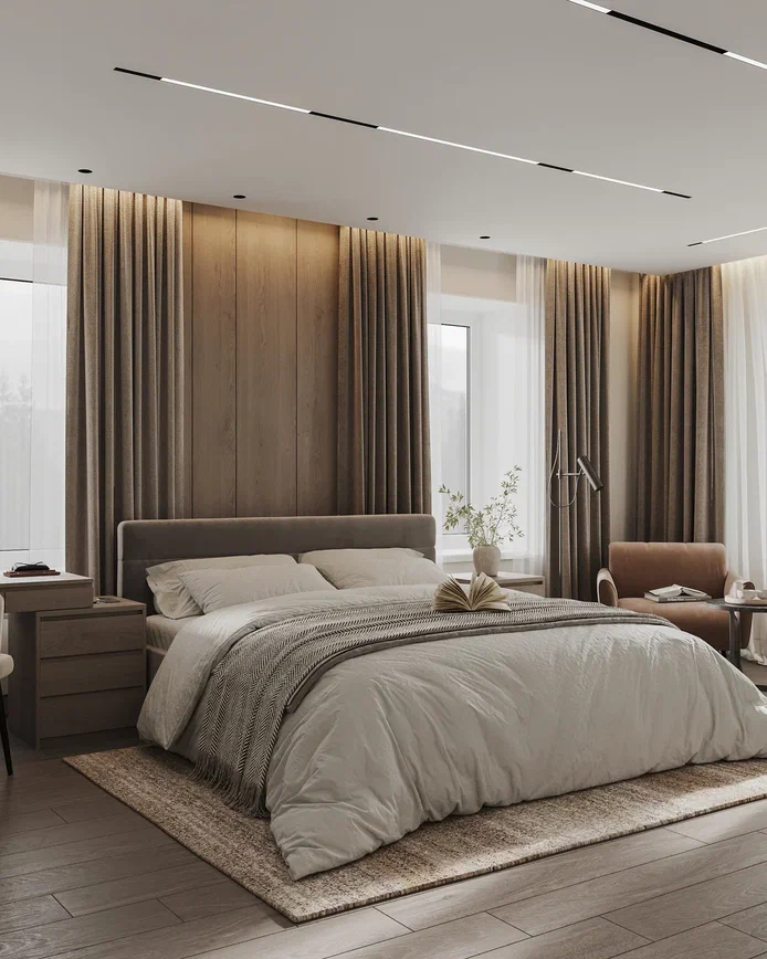 Спальня получилась спокойной и гармоничной — благодаря тёплой палитре, текстильным шторам в пол и деревянным панелям за изголовьем кровати. Центр композиции — мягкая кровать с нейтральным текстилем, дополненная прикроватными тумбами и уютным креслом для отдыха.