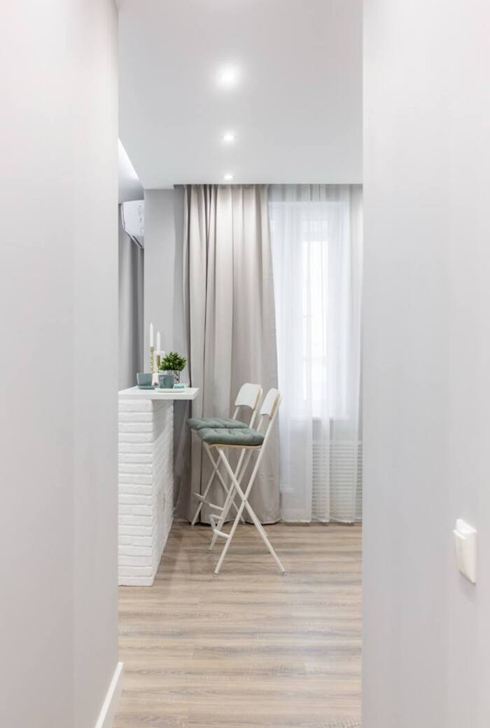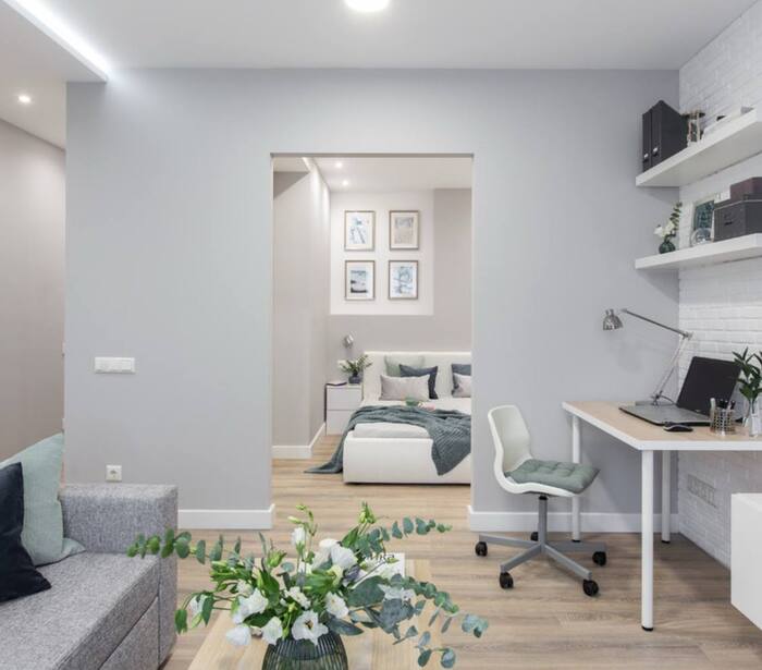 Отделка стен — краска и лепнина в одном тоне, чтобы не дробить пространство. Продумана и логистика: всё, что нужно — на своём месте, ничего лишнего.