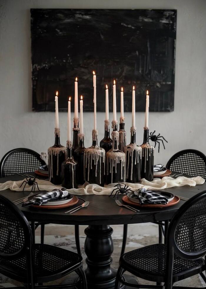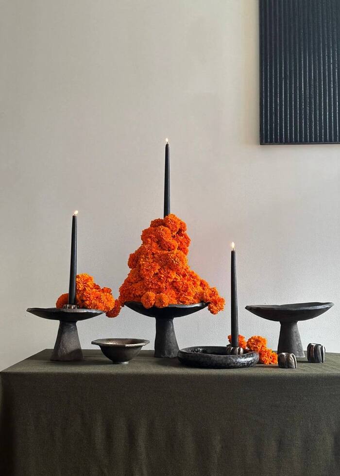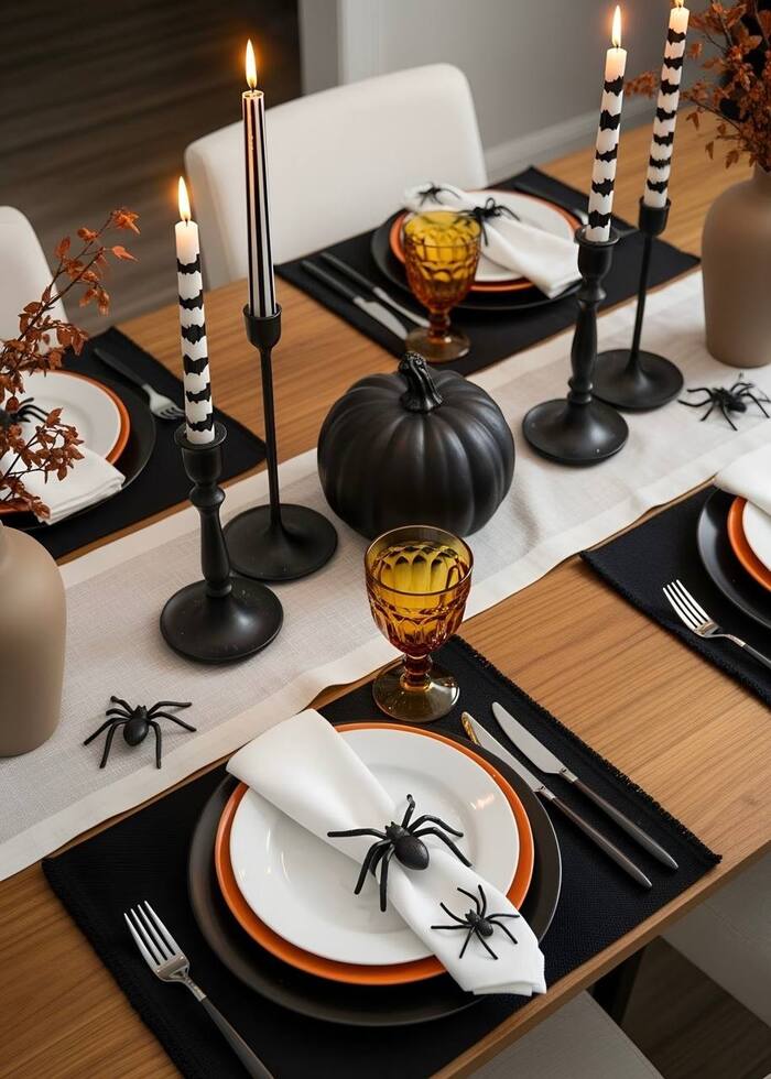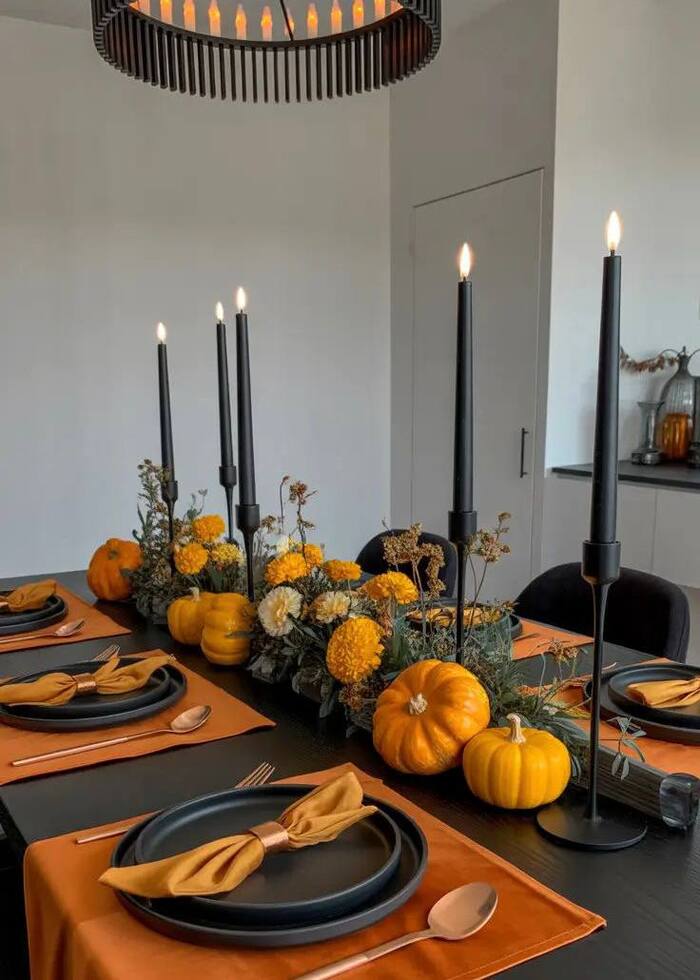 Взрослый и стильный декор — это сочетание чёрного, оранжевого, свечей и минималистичных деталей.