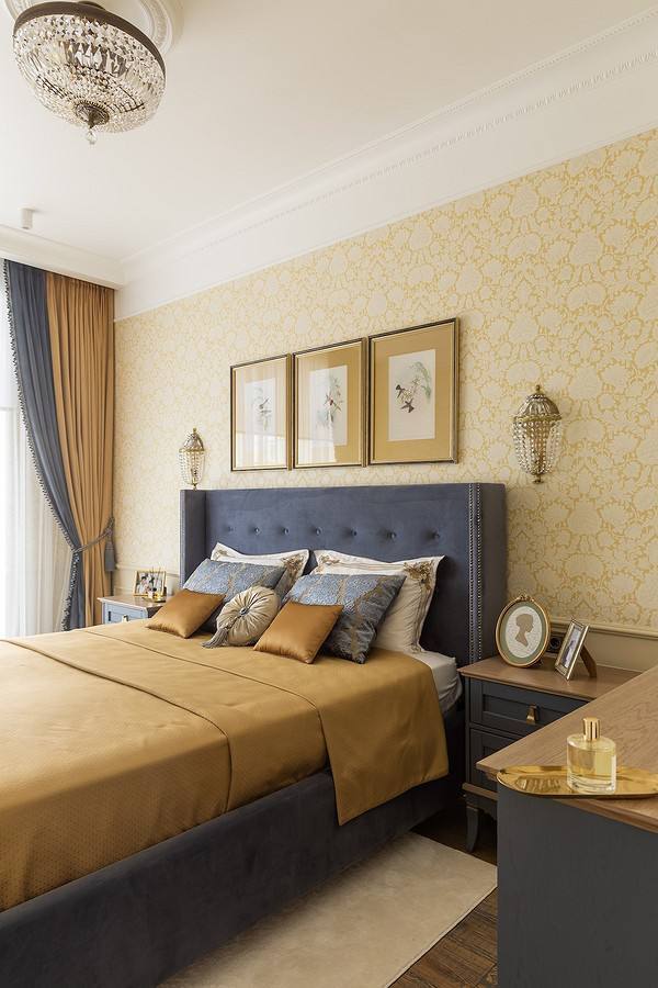 Главный элемент спальни — кровать с мягким изголовьем в светло-бежевом текстиле и контрастным декоративным текстилем. По обе стороны расположены подвесные прикроватные тумбы с бра в золотистом цвете.
