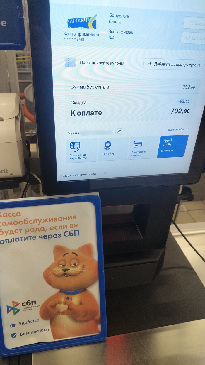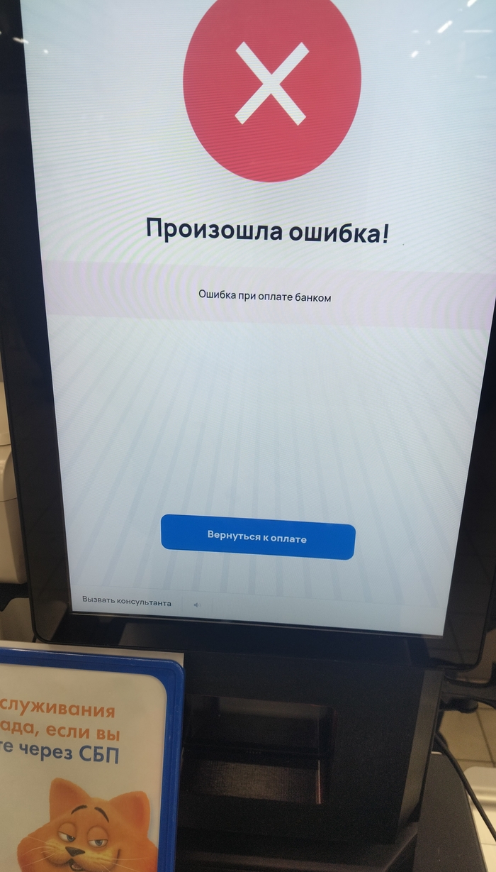 Зову волшебную фею женщину-консультанта, спрашиваю, что не так с этой кассой. Мне объясняют, что вот же тут на табличке с котиком для идиотов написано, что оплата только через СБП. На моё резонное замечание, что "будет рада" и "оплата только через" это несколько разные вещи - лишь пожимает плечами и что-то бормочет. Не слушал уже, что именно.