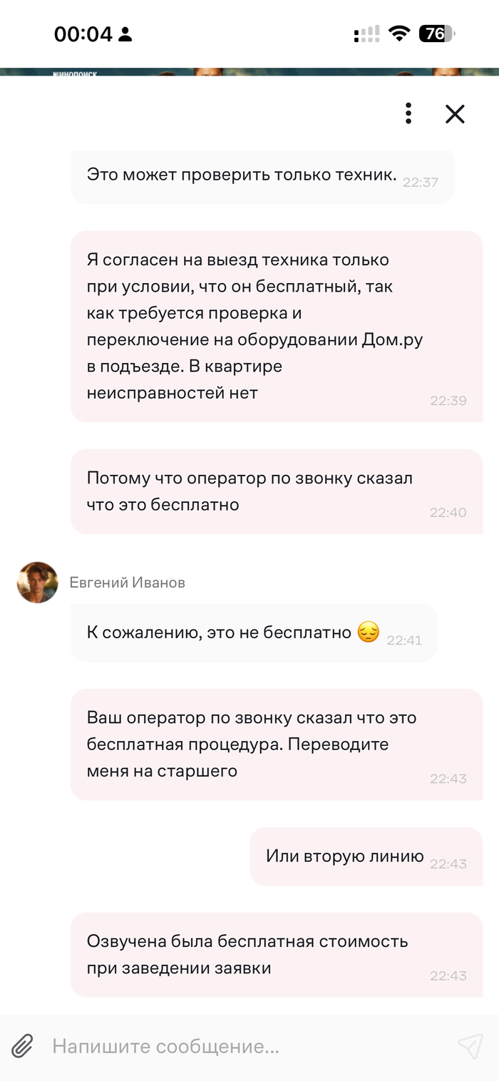 Ответы разных спецов вводят в заблуждение: один говорит «выезд бесплатный», другой — «не бесплатно», третий вообще «нельзя перевести на старшего».