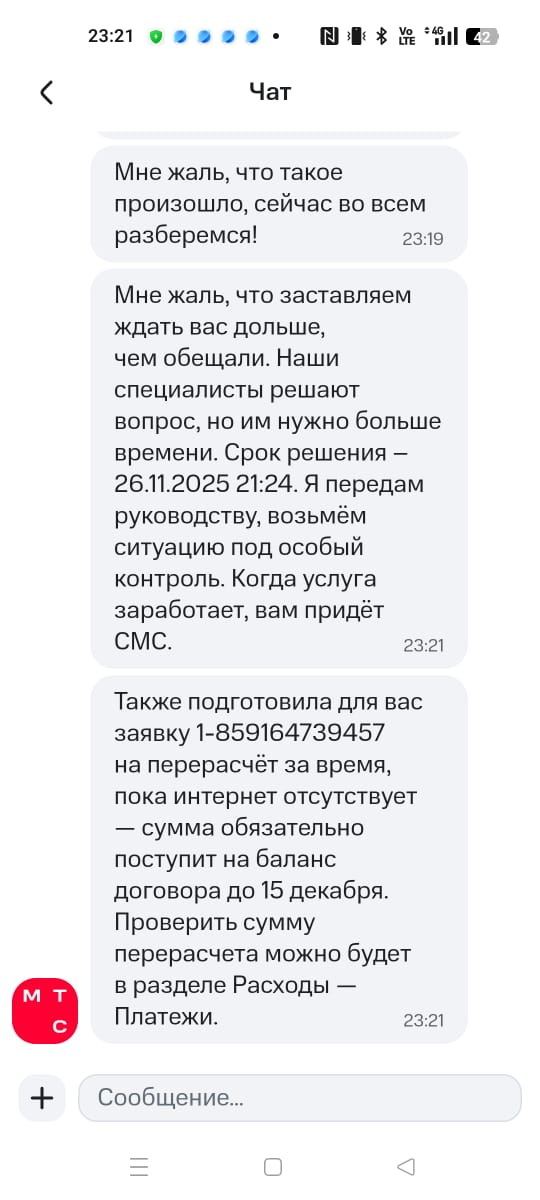 Они так часто говорят про «контроль», «особый контроль», «нам очень жаль» и «мы сожалеем», что всё это уже звучит как название отдела по издевательству над клиентами. И конца-края этому, как видно из переписки с поддержкой, не видать. Последний их ответ (вчера): «до 02.12.2025» во что мы уже даже и не верим. Пора вывешивать табличку «Здесь был ОСОБЫЙ КОНТРОЛЬ МТС» на развалинах нашего подключения.