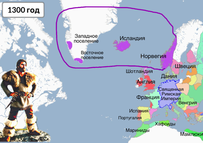 А в 982 году в Гренландию приплыл из Исландии, изгнанный за убийство, викинг Эрик Рыжий с семьей и слугами. Эрик назвал землю Зеленой страной - Гренландией. Почему так назвал, непонятно. Может хотел этим привлечь побольше поселенцев или климат тогда был теплее. И в Америку потянулись первые корабли с эмигрантами из Европы. В эпоху расцвета в Гренландии жило около 5000 поселенцев. Кстати, сейчас европейцев в Гренландии столько же. Разводили и скот, охотились на оленей-карибу, медведей, моржей и тюленей. Почему-то ели очень мало рыбы. В поселениях викингов почти не находят рыбных костей. Экспортировали в Европу моржовые бивни, шкуры оленей и тюленей. Импортировали оружие, железо. У островитян был свой епископ и они считали себя подданными короля Норвегии. [4]